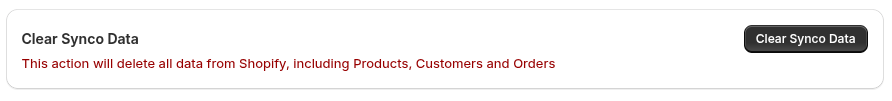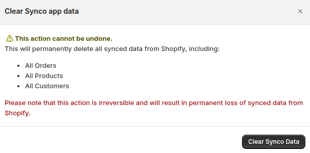 Clear Synco Data removes all syncing information saved in Shopify that is required for app functionality. This action permanently deletes mapping data that shows which Shopify items are synced to Odoo.